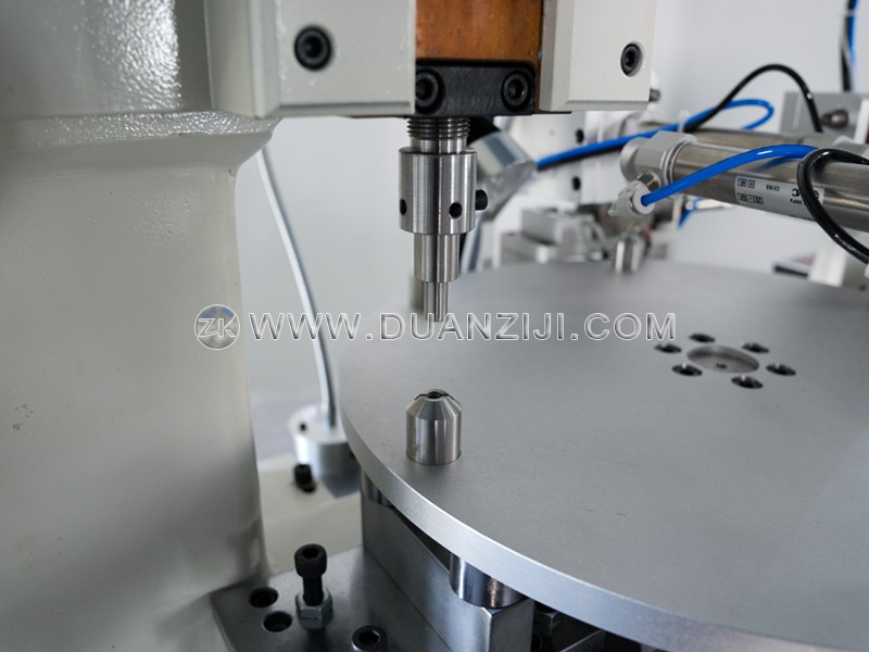 这是一台为珠宝行业客户非标订制的全自动磁铁压入机,用于把磁铁放入银制杯体中并压接固定,银制杯体通过振动盘自动送料。转盘式设计,杯体上料、磁铁放入、杯体卷边压接、成品取出一气呵成。