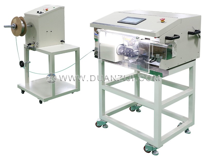 在核心切割工艺上,设备采用了先进的三刀分离系统,确保每一道工序都达到专业标准。旋转刀机构负责对每一层材料进行360度精密环切,剥皮精度可达0.01mm,能够根据预设深度精准穿透屏蔽层或绝缘层而绝不伤及内芯;平刀机构则负责主线材的垂直切断,确保端部平整无变形;而专门的V型刀机构配合自动吹气装置,可高效拉除废料并即时清理加工碎屑,保证了高频连续生产的稳定性。